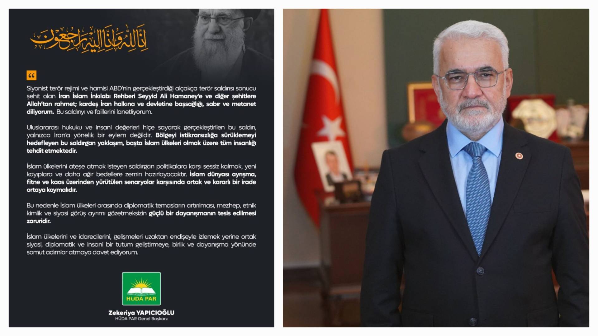 HÜDA PAR Lideri Yapıcıoğlu, Hamaney’in şehadeti üzerine taziye mesajı yayımladı
