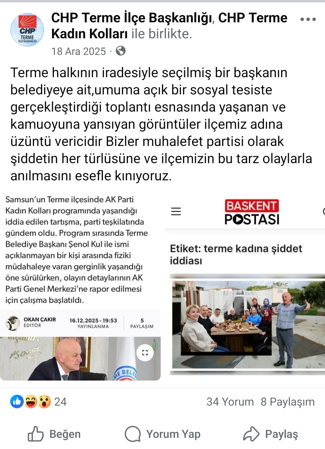 Geçtiğimiz aylarda Terme Belediyesi’ne ait Yalı Cafe’de yaşandığı iddia edilen bir olay da gündeme geldi. İddialara göre, Belediye Başkanı’nın eşi ve bir yakını ile AK Parti Kadın Kolları Başkanı arasında yaşanan tartışmanın fiziki müdahaleye dönüştüğü ve tarafların hastane ile emniyete başvurduğu öne sürüldü. Söz konusu olayla ilgili resmi bir açıklama yapılmaması eleştirilere neden oldu.