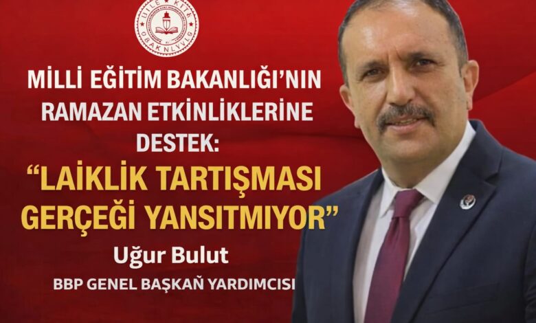 BBP Genel Başkan Yardımcısı Uğur Bulut, Milli Eğitim Bakanlığı’nın okullarda Ramazan ayının manevi atmosferine yönelik başlattığı etkinliklere destek verdi. Bulut, uygulamanın toplumsal karşılığı olduğunu belirterek, laiklik tartışmalarına ilişkin değerlendirmelerde bulundu ve çocukların milli ile manevi değerlerle yetişmesinin önemine dikkat çekti.