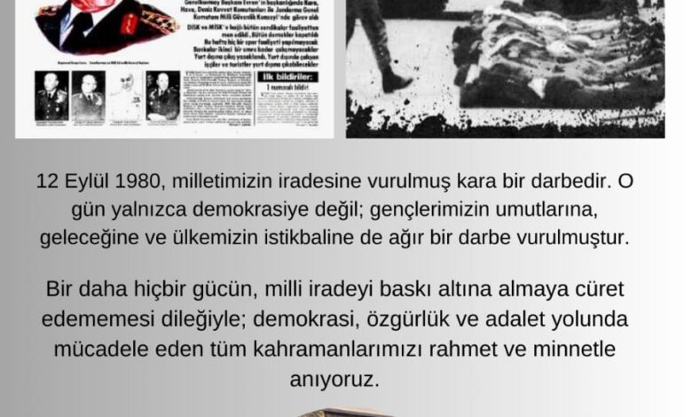 12 Eylül 1980, milletimizin hafızasında demokrasiye vurulmuş kara bir leke olarak yerini almıştır. O gün, yalnızca siyasi hayat değil, aynı zamanda gençlerimizin geleceği, özgürlüklerimiz ve toplumsal huzurumuz ağır bir darbe almıştır.