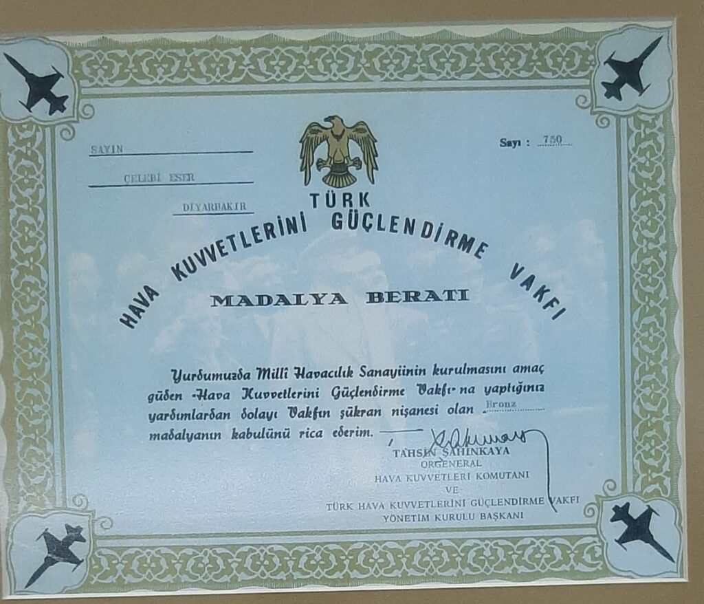 Çelebi Eser’le özdeşleşen eserlerin arasında Diyarbakır’ın simgesi olan meşhur Zafer Anıtı da var. 30 Ağustos 1972’de açılışı yapılan Valilik önündeki Zafer Anıtı nedeniyle dönemin mülki idaresi tarafından Çelebi Eser’e şükran belgesi takdim edildi …